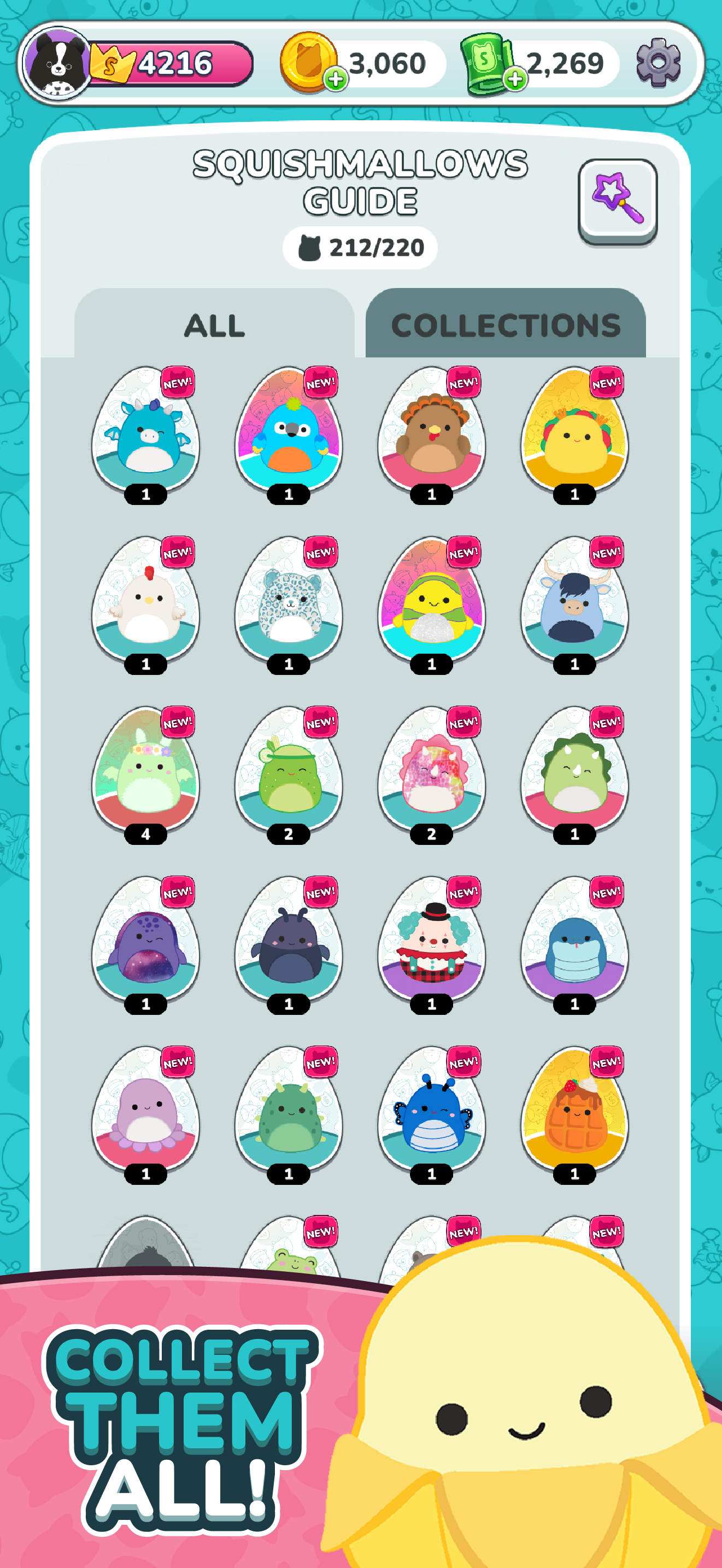 - Squishmallows Hunt: Want to find that special Squishmallows? Use Magnets for a better chance to get the one you want, and add your favorites to your Wishlist and unlock with Keys.