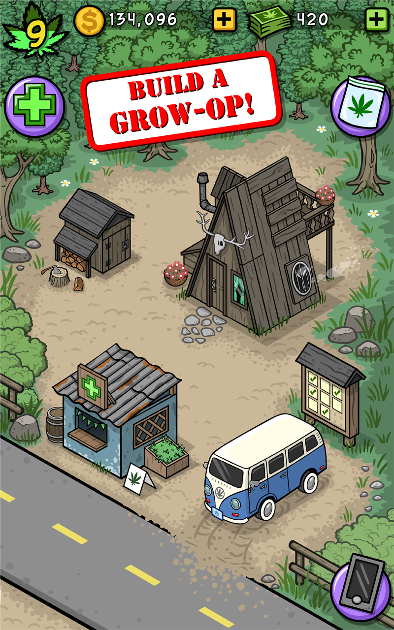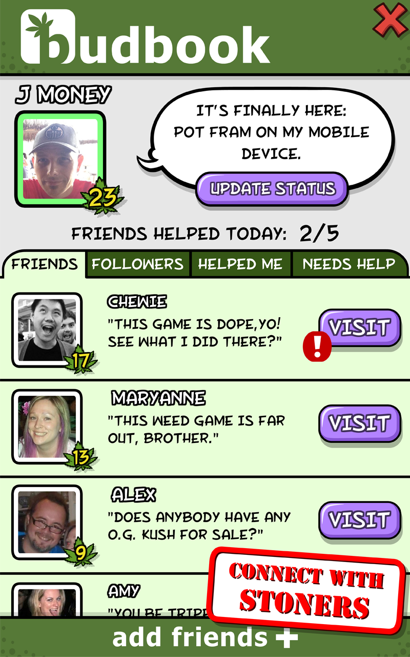 Grow your own weed and start a 420 friendly farm! For the first time ever, the #1 marijuana farming franchise Pot Farm is on your mobile device. Pot Farm: Grass Roots is the mobile successor to the studio’s smash hit, Pot Farm, a Facebook game with over 8 million players.Players can grow and harvest real life strains like OG Kush, Super Silver Haze, and Pineapple Express in their grow ops and run their very own dispensary. Sell pot to other online players on FloydsList and connect with friends through the game’s premiere social network for potheads, Budbook.